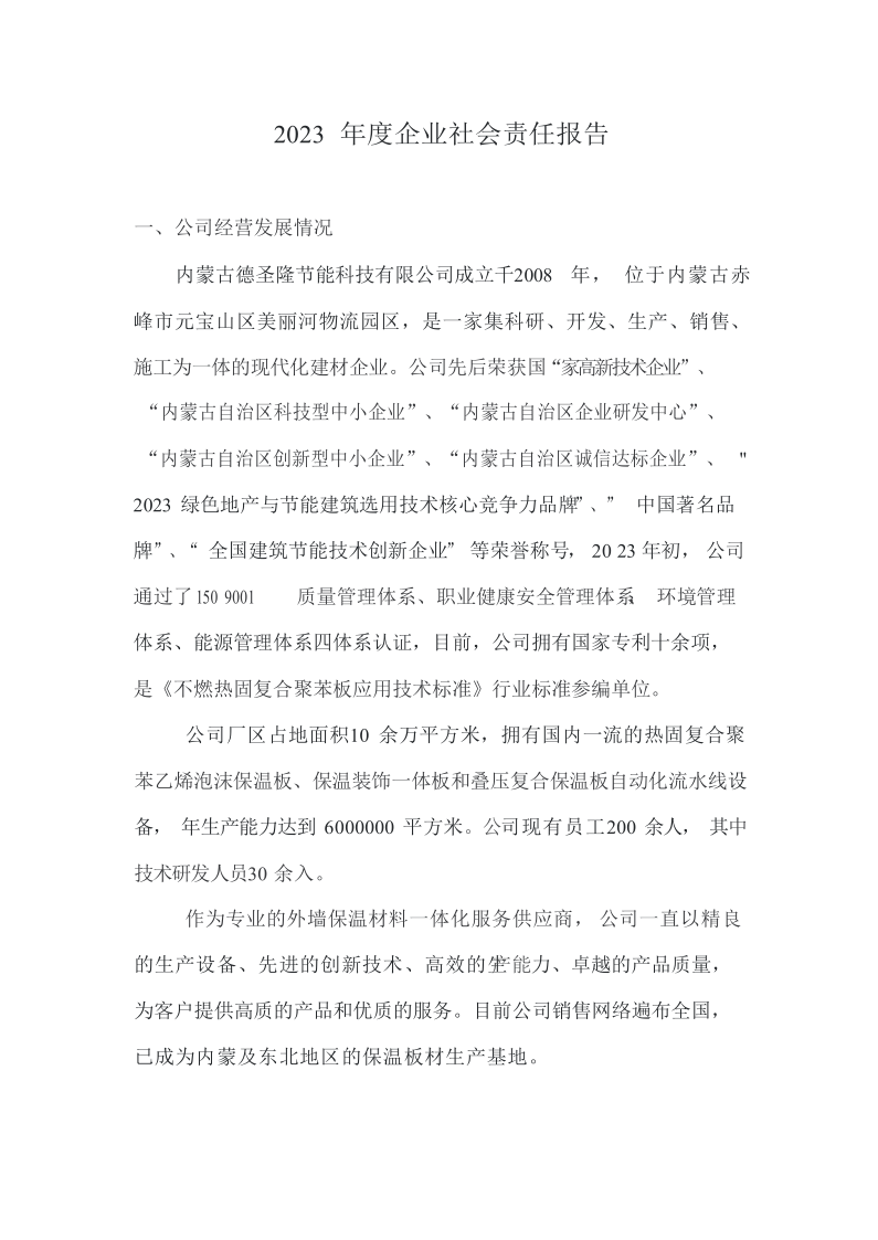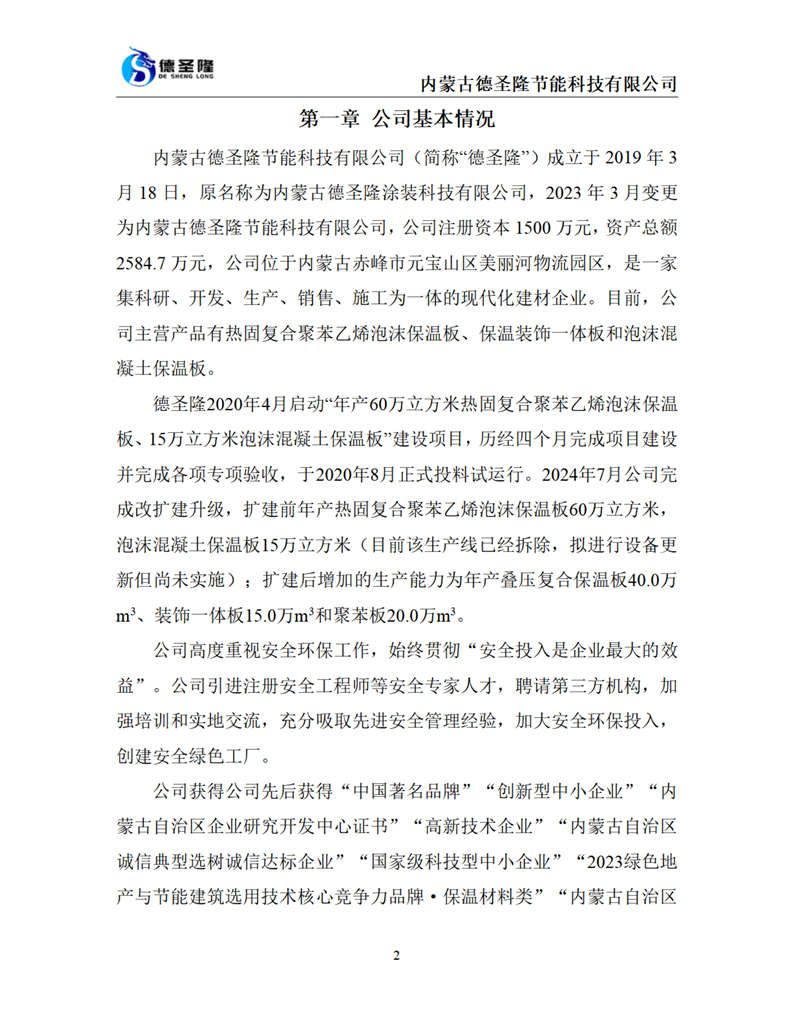 內(nèi)蒙古德圣隆節(jié)能科技有限公司成立于2019年,位于內(nèi)蒙古赤峰市元寶山區(qū)美麗河鎮(zhèn)物流園區(qū),是一家集科研、開發(fā)、生產(chǎn)、銷售、施工為一體的現(xiàn)代化建材企業(yè)。公司主營(yíng)產(chǎn)品:熱固復(fù)合聚苯乙烯泡沫保溫板、保溫裝飾一體板和泡沫混凝土保溫板,年生產(chǎn)能力達(dá)到6000000平方米。
